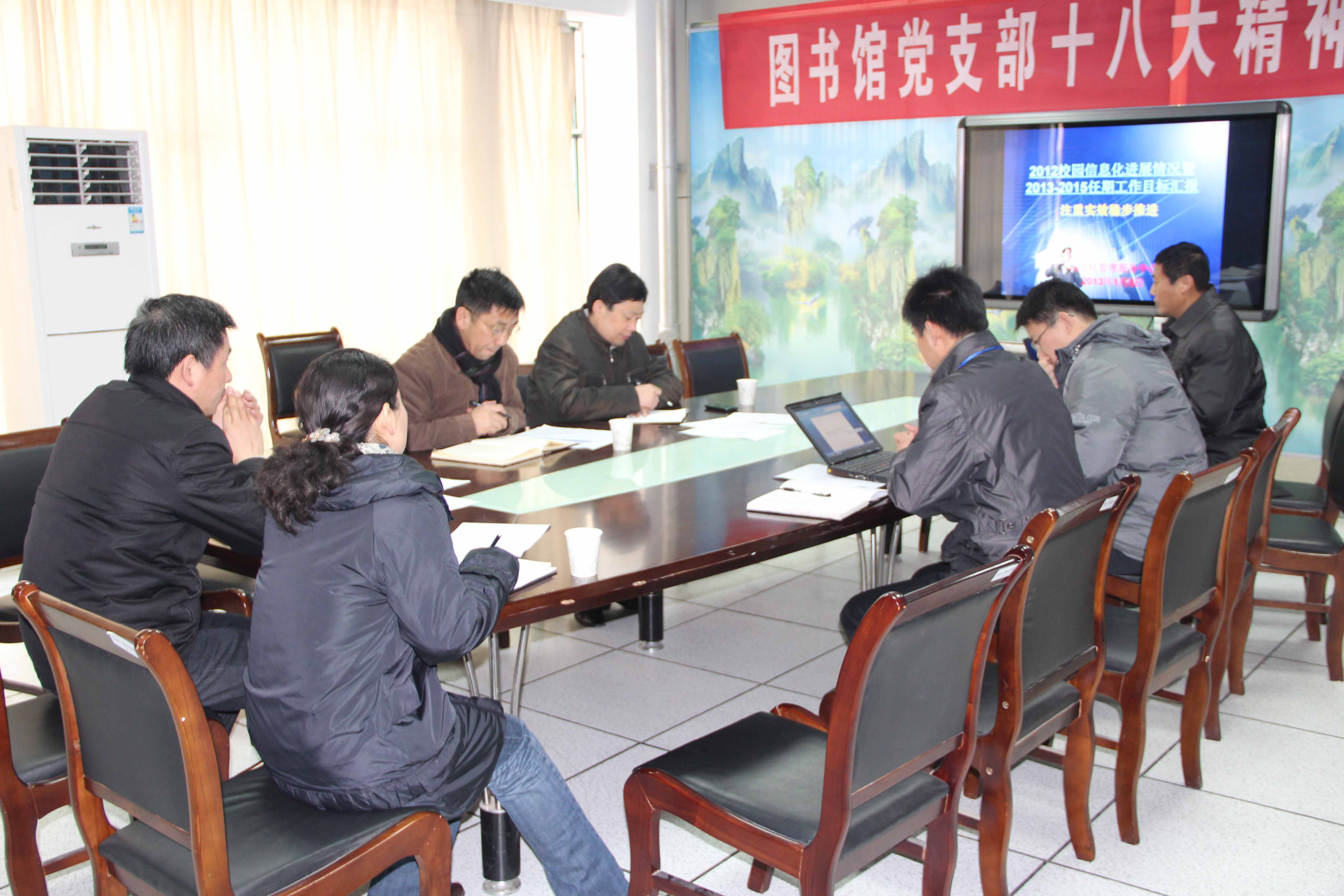 调研会上,袁德明主任就学校信息化建设的总体状况、取得成就、十二五规划做了整体汇报;袁宇翔老师就学校信息化建设中的重要工程项目做了汇报;吴兆立老师就学校信息化建设中的技术实施做了汇报。袁德明主任就信息化管理服务中心所遇到的问题也逐一向吴院长做了汇报。